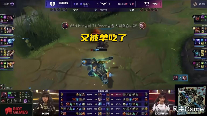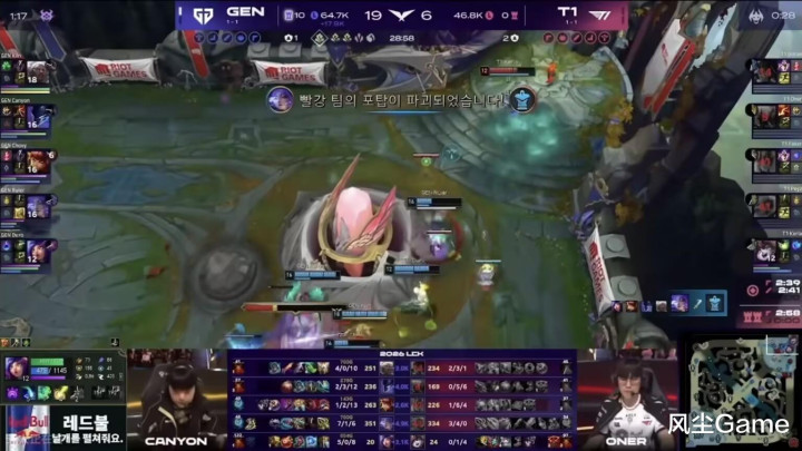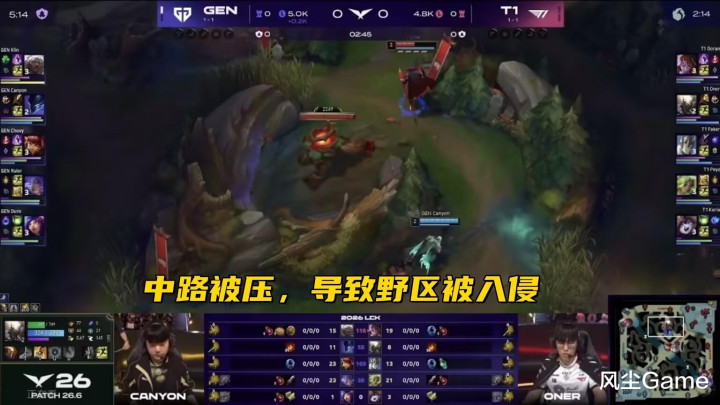 同一天的另一场比赛,是T1大战GEN,这场BO3开打之前,不少观众都觉得,T1是有机会赢的,因为GEN这个赛段的状态,没有之前好,KT都掀翻过他们,但联赛内的T1,战力还是太低了,老李不仅没能赢GEN,甚至还反被零封,第二把更是被打出了0龙塔的巨大差距,线都被碾压。