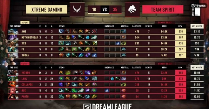 [35分钟]上路团战Yatoro拍拍跳脸开大输出,panto术士链接配合Larl土猫AOE瞬间爆炸了啊!Spirit又一次团灭了XG,准备破三路,XG想最后一搏但是对手几个大哥都有BKB啊!Yatoro拍拍开着BKB拍晕三下一个!Larl土猫还有个A杖技能变石头!Ame飞机再次倒下,XG也敲出了GG!输给Spirit之后掉入败者组!