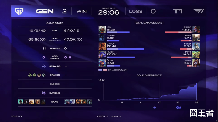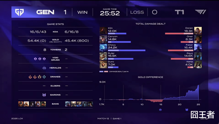结果第一局比赛,T1仅在开赛时占据领先,但是到了比赛中期,就是GEN的天下了,而且GEN将比赛,打成了速胜局。比赛第9分钟,Kiin塞恩对位单杀Doran杰斯,两队前期一度互有来回;比赛第15分钟,GEN先锋团龙坑围攻一波打出1换4大胜,此后GEN开始占据主动;比赛第22分钟,T1上野先后强行开团,GEN反打0换4后拿下大龙;最终比赛第25分52秒,GEN抓掉Doran杰斯后顺势一波结束比赛。