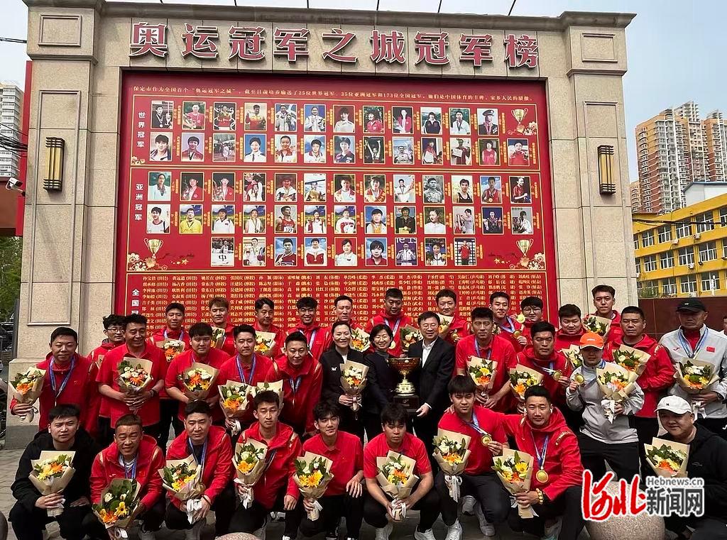 回到保定市区后,队员们第一站来到保定市体育局,在“奥运冠军之城冠军榜”前合影,大家齐声高喊着“保定是冠军!”