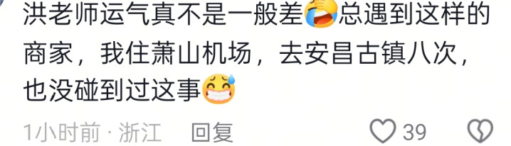 还有的网友说: 洪老师运气真不是一般差,总遇到这样的商家,我住萧山机场,去安昌古镇八次,也没碰到过这事!